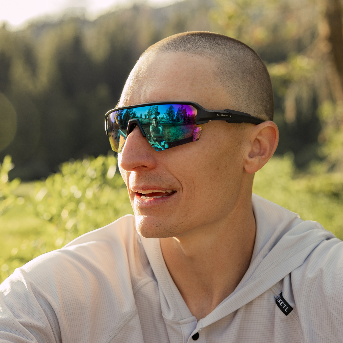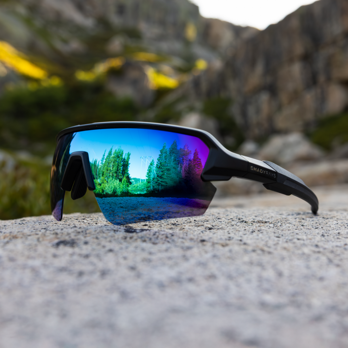 Built for motion, this semi-rimless sport frame provides panoramic coverage, lightweight comfort, and a no-slip rubber grip that stays in place. Matte Black TR-90 frame designed for a flexible lightweight fit and extreme durability. Semi-Rimless design for an unobstructed downward view. Premium Polarized blue mirrored