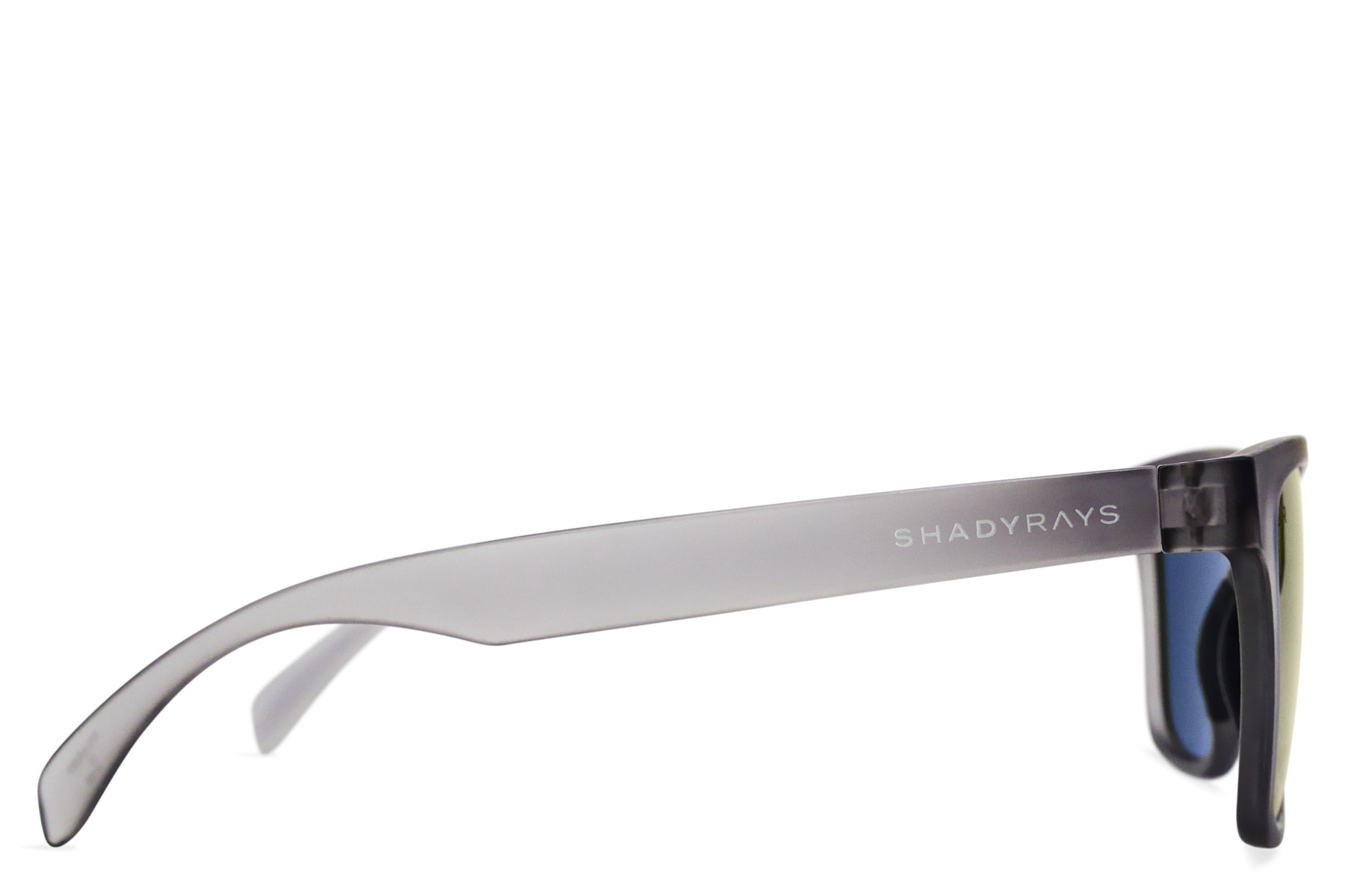 A versatile frame ready for casual wear or active use. Available in best-selling Shady Rays colorways. Durable matte transparent grey frame  Rubber nose pads and snap hinges provide grip and comfortable fit Polarized, purple mirrored lenses with grey tint: 100% UV protection / shatter-resistant / salt water resistant I