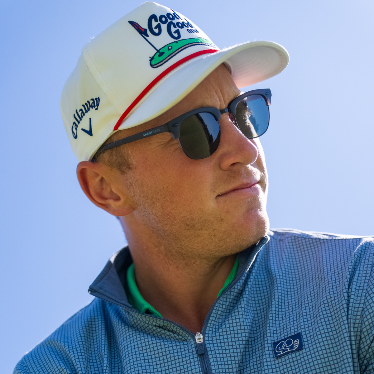 Our newest collab with Good Good Golf! Designed for the course and beyond, this modern take on a vintage style features a sleek translucent matte-black frame with matching black accents. Perfect for your round or your post-game unwind. A matte-black frame with metal hinges featuring 'Fighting for Par' written on the te
