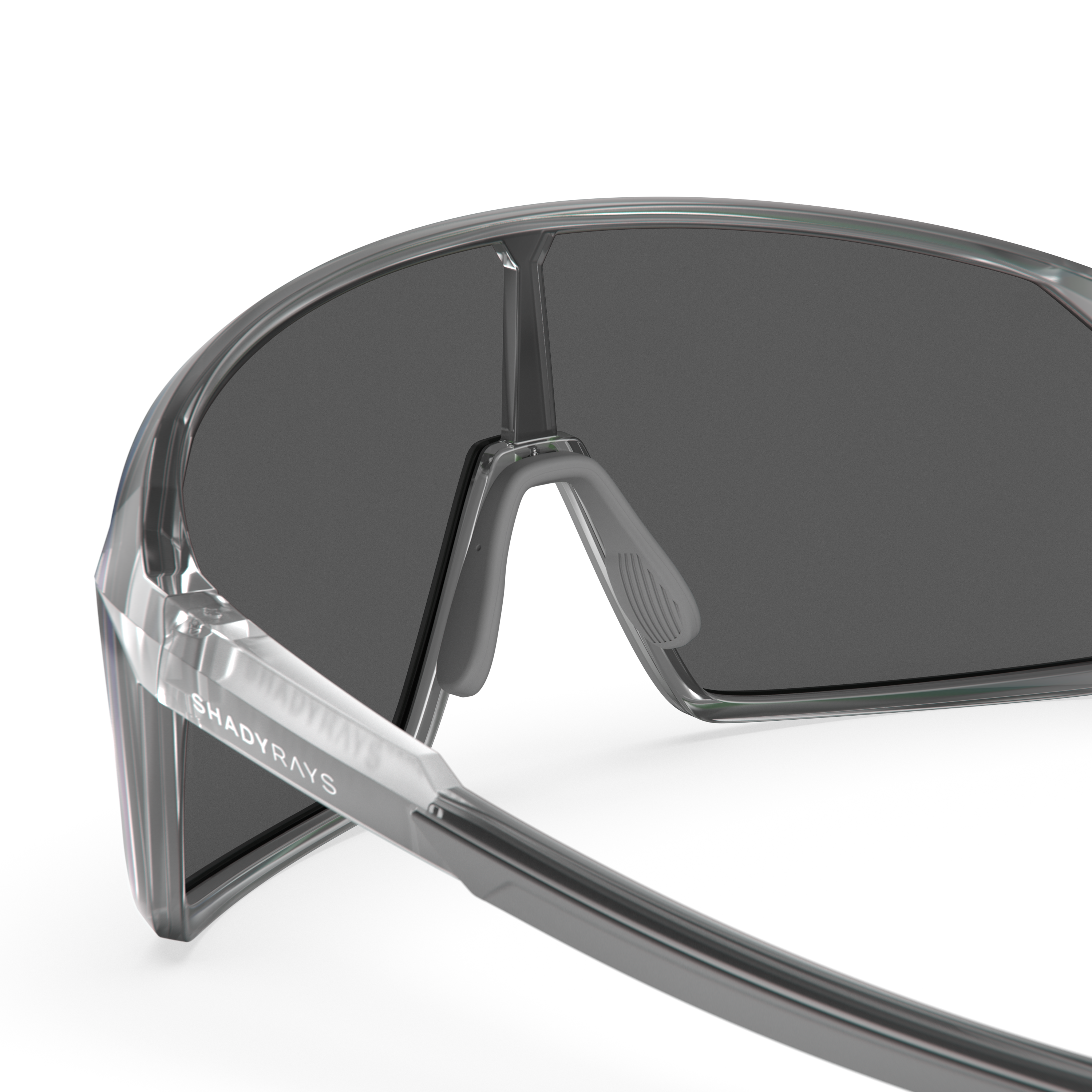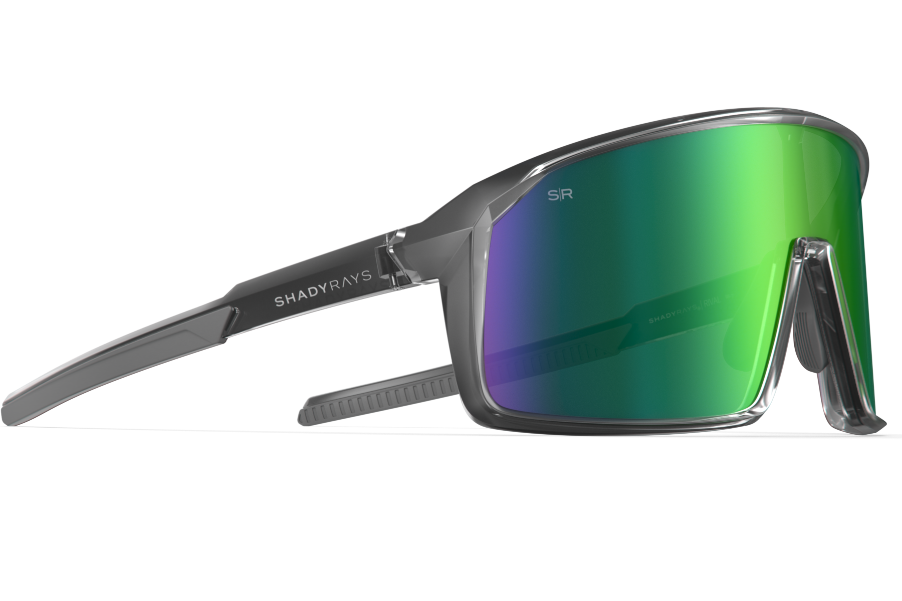 Single lens sport frame designed for optimal coverage and clarity featuring rubber accents for a stay-in-place no-slip fit. Gloss translucent smoke grey TR-90 frame designed for a flexible lightweight fit and extreme durability. Single lens design for a panoramic view. Premium Polarized Emerald Green mirrored lenses wi