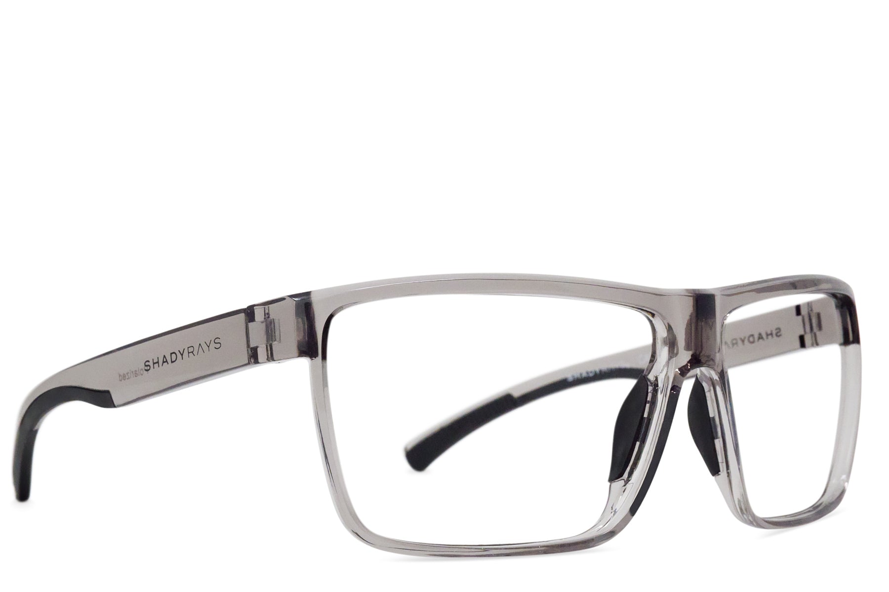 Translucent smoke grey TR-90 frame with raised logos, complete with prescription lenses custom-made for you in our US-based optical lab. Includes signature hard case. This frame can only support prescriptions between +/-5.00.  If you are unsure if your Rx meets these standards, email optical@shadyrays.com and we'll let