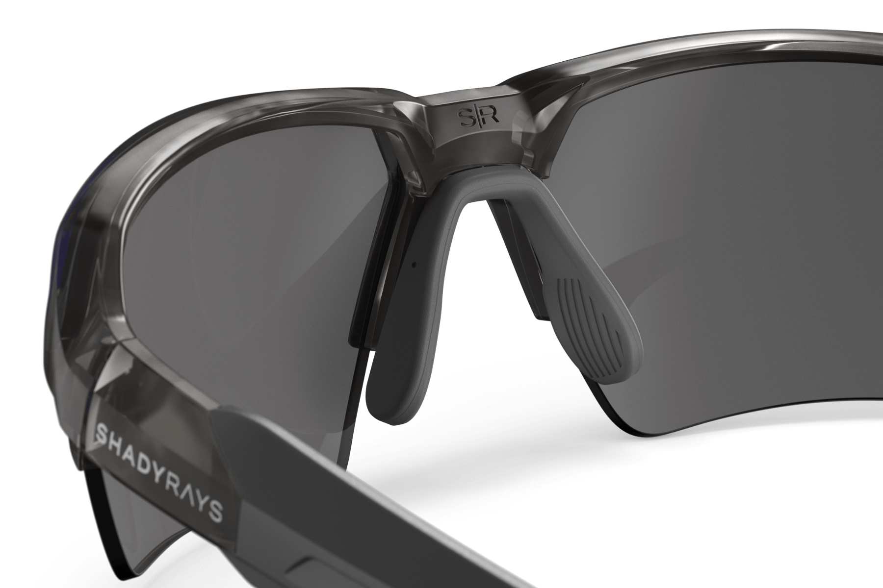 Made for movement, this rimless sport frame is designed for performance and built from ultra-durable lightweight materials. Featuring dual injected rubber accents for a no-slip fit and all day comfort. Translucent smoke grey TR-90 frame designed for a flexible lightweight fit and extreme durability. Rimless bottom for