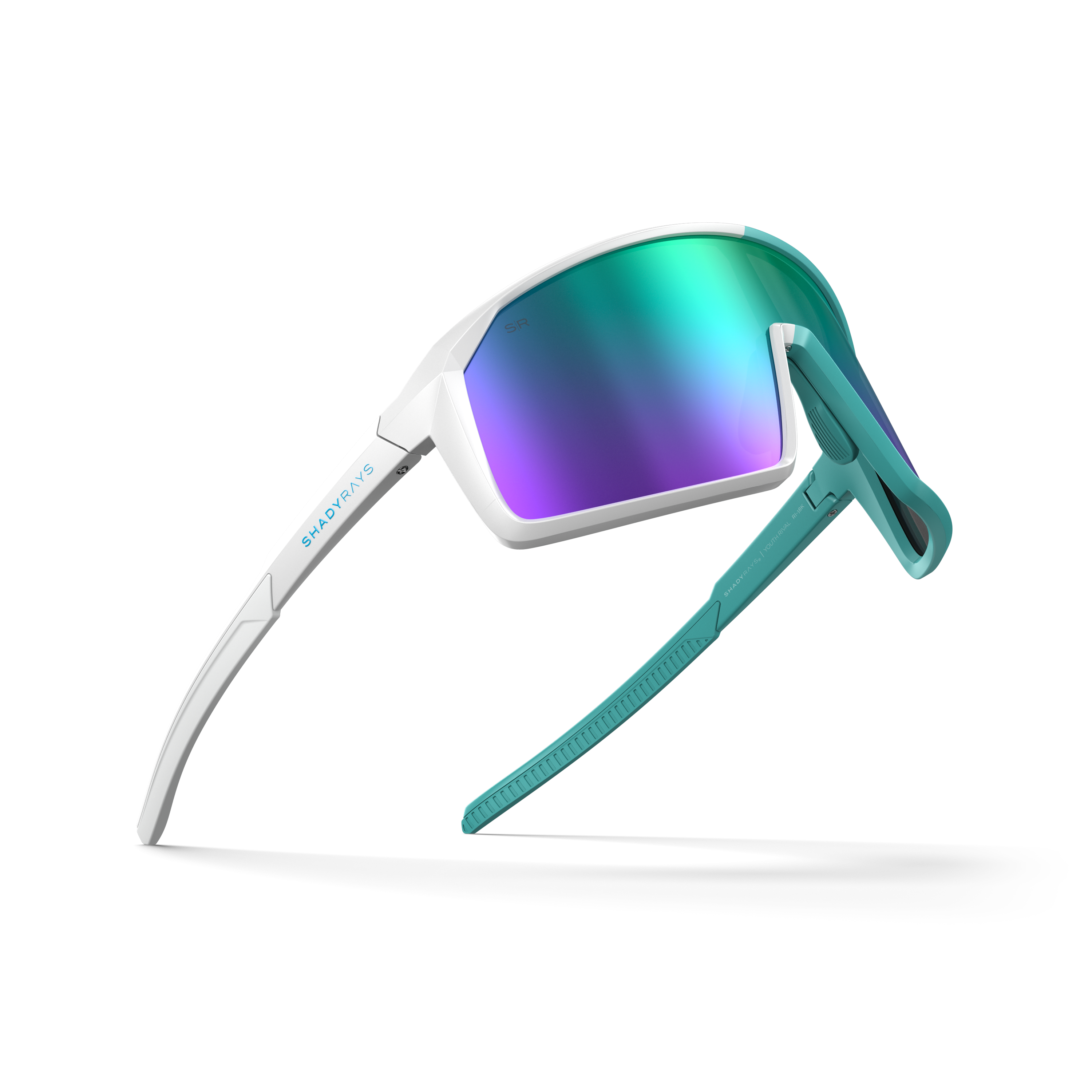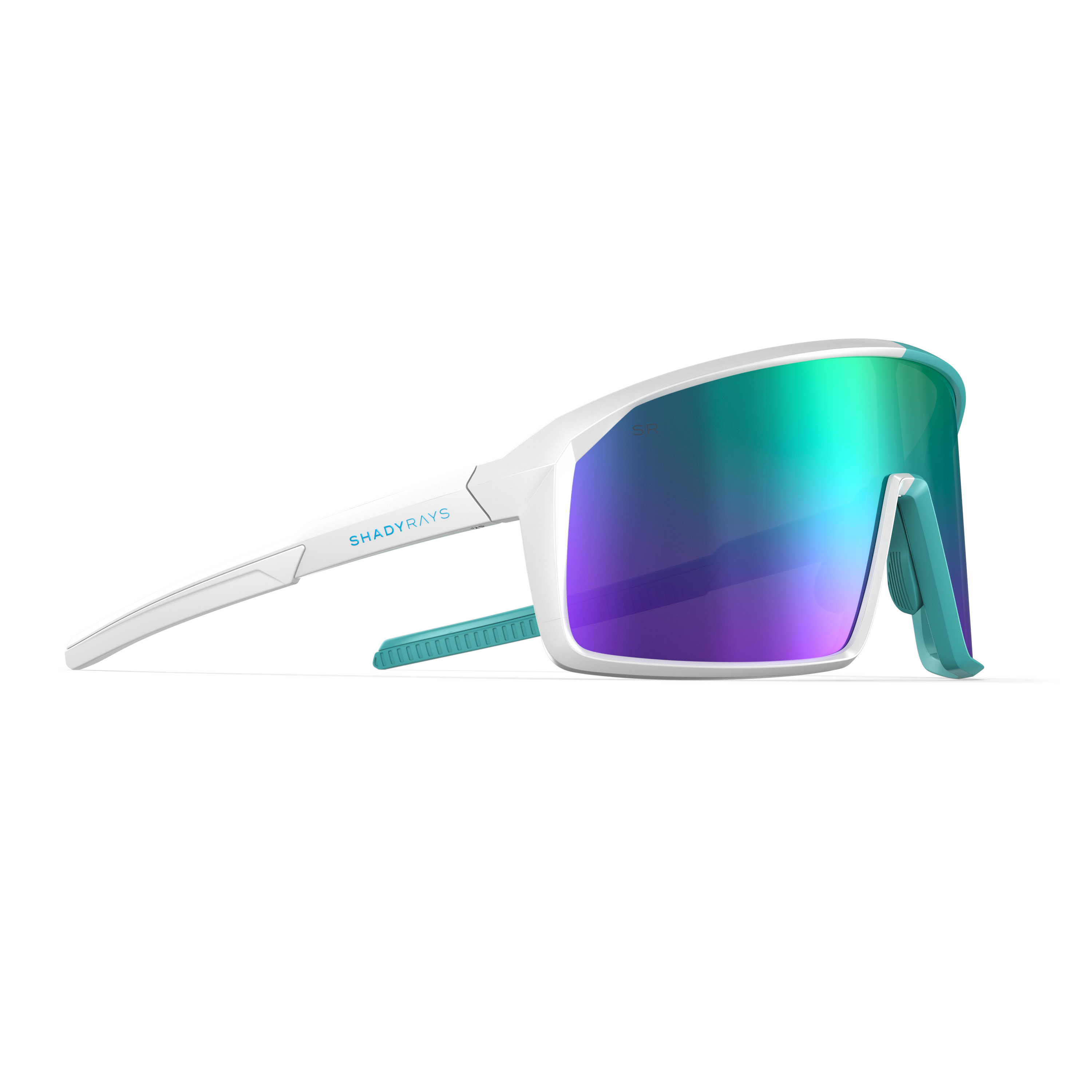Single-lens sport frame built for young athletes who play hard and move fast. Designed for ages 6 to 12. It offers a full coverage, sharp clarity, and rubber accents that keep it locked in place throughout every inning, Sprint or spike. Gloss split Teal and White TR90 frame designed for a flexible lightweight fit and e
